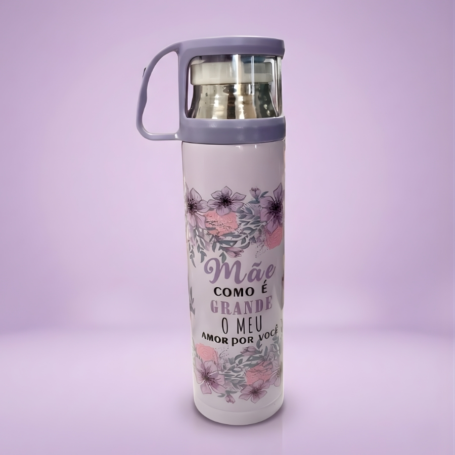 Garrafa térmica com capacidade de 470ml, acabamento na cor roxo e estampa com a frase “Mãe Como é Grande o Meu Amor Por Você”. Indicada para conservação de bebidas quentes ou frias por determinado período, conforme especificação do fabricante. Recomenda-se higienizar antes do primeiro uso. Consultar o rótulo para informações sobre tempo de conservação térmica. Não utilizar em micro-ondas ou freezer, salvo indicação expressa do fabricante. Evitar quedas, impactos e produtos abrasivos para preservar a estampa e a integridade do produto.