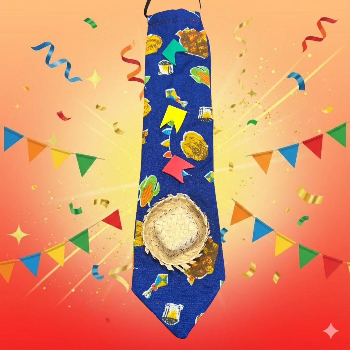A Gravata de Festa Junina na versão azul festivo é um acessório alegre e versátil para compor looks típicos das comemorações juninas. Com visual vibrante e temático, ela traz o clima tradicional da festa, destacando-se pelos detalhes decorativos que remetem ao universo caipira. Na ponta, conta com um chapeuzinho de palha colado, elemento característico que deixa a peça ainda mais charmosa.