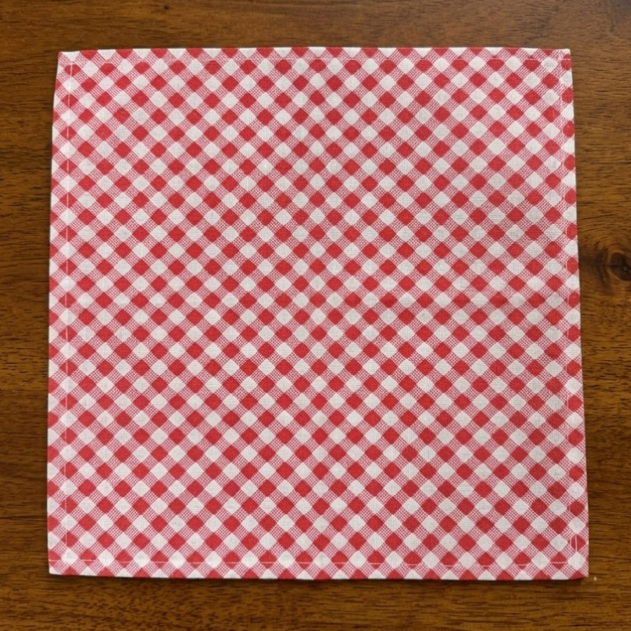 Guardanapo com estampa chita xadrez na cor vermelha. Possui dimensões aproximadas de 38x40cm. Indicado para uso em refeições e decoração de mesas em festas e eventos temáticos. Produto leve e de uso prático. Recomenda-se evitar contato com superfícies úmidas antes do uso para preservar o material. O produto pode conter pequenas variações de cor e tamanho dependendo do lote.