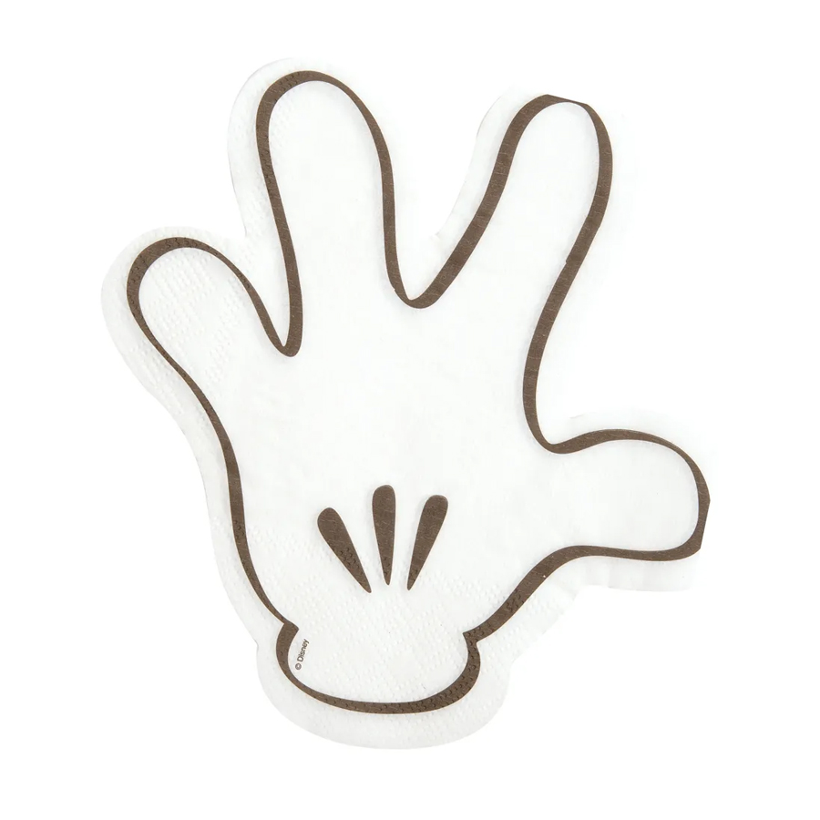Guardanapo de papel com formato da luva do Mickey, nas cores padrões do personagem, medindo 16 cm.