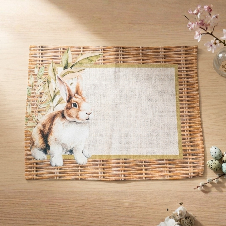 Adicione um toque encantador à sua mesa com o Jogo Americano Retangular Coelho Palha! Seu design rústico e o adorável coelho em destaque trazem a atmosfera acolhedora da fazenda para suas refeições.