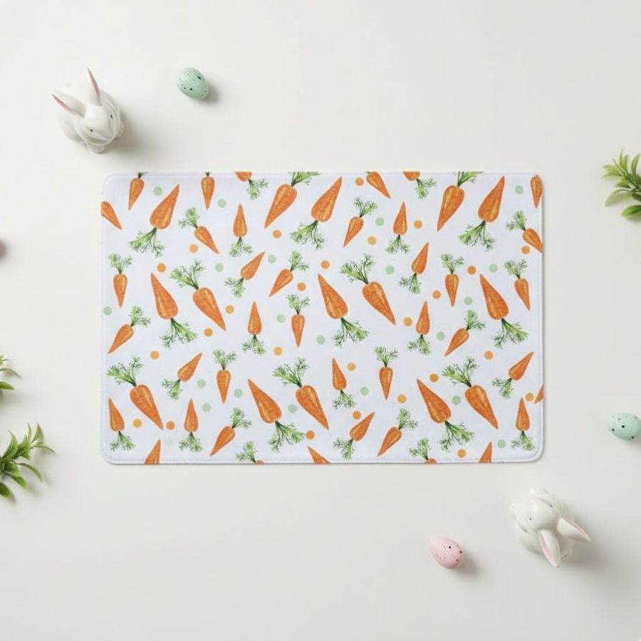 Jogo americano retangular de Páscoa com estampa de cenourinhas, ideal para decorar e proteger a mesa durante as celebrações. Mede aproximadamente 28x43cm e adiciona charme e identidade à mesa pascal.