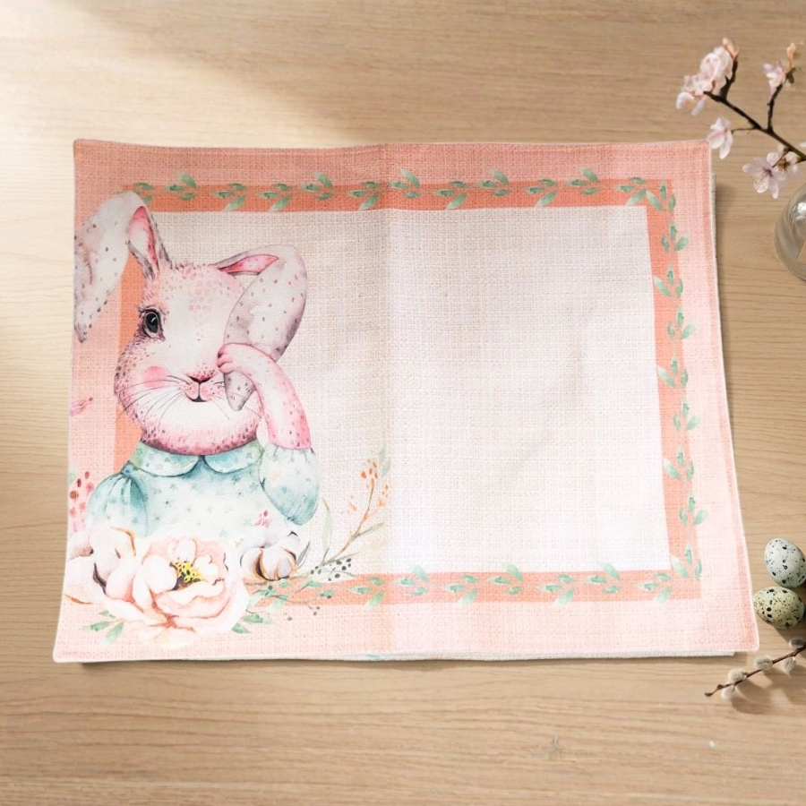 Jogo americano retangular com coelho e peônias em volta