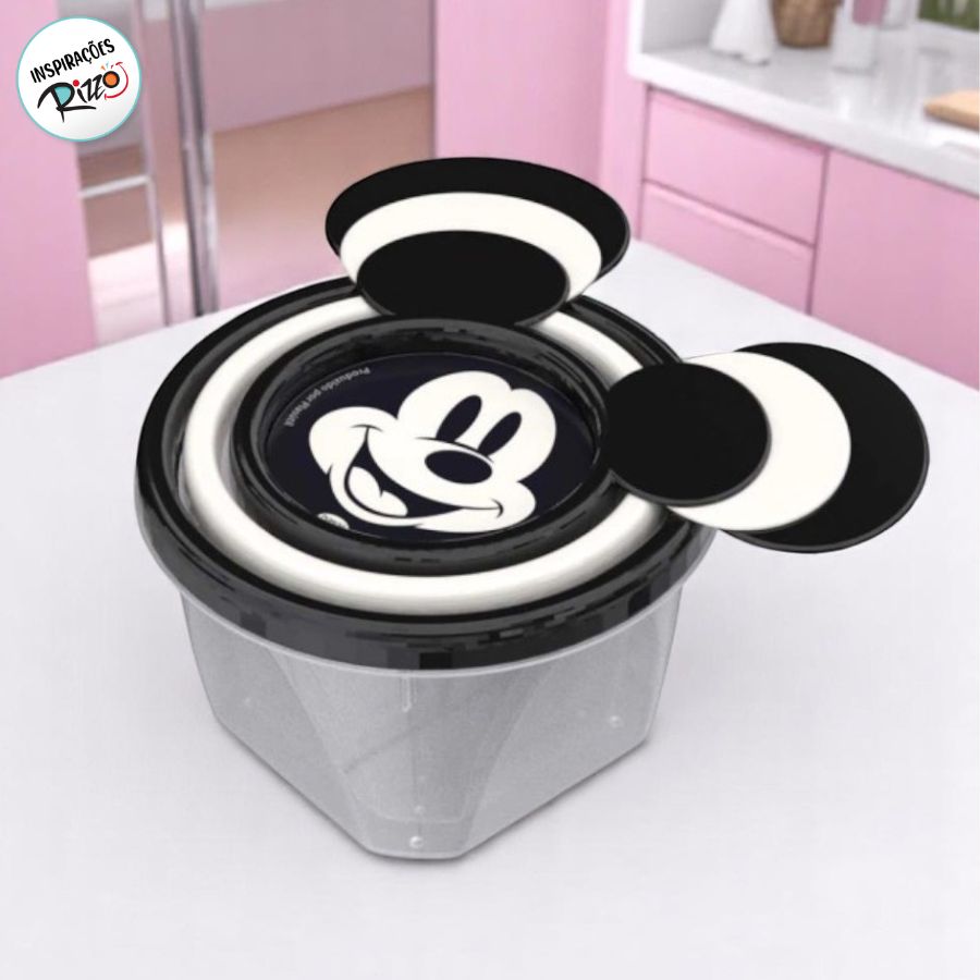 O Kit de potes Mickey une funcionalidade e estilo em um conjunto que facilita a organização da rotina. Com três tamanhos diferentes, é ideal para armazenar lanches, frutas, snacks ou pequenas porções de alimentos. As tampas decoradas com orelhas do Mickey e arte em preto e branco garantem um visual moderno que encanta adultos e crianças.