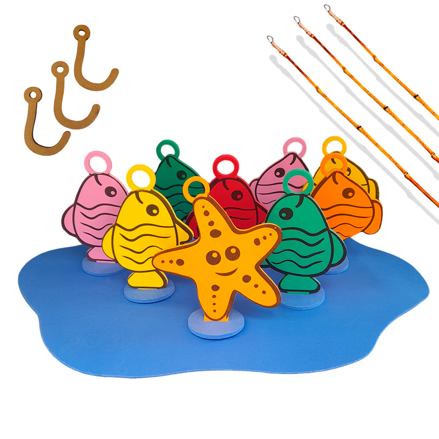 Embalagem com 3 varas de pescar com 100cm de altura, 3 anzóis de pesca em MDF medindo 4,5cm de largura x 6cm de altura com 3 fios de nylon de 1 metro, um mini lago de EVA medindo 37cm x 50cm, 8 peixes de EVA com base de EVA em cores sortidas medindo 10cm de largura x 16cm de altura, 1 estrela de EVA com base em cores sortidas medindo 13cm de largura x 15 cm de altura.