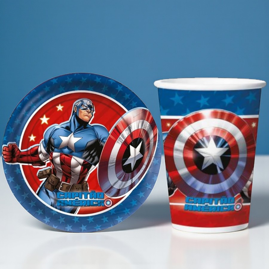 Para potencializar o visual do Kit Copo e Prato de Papel - Capitão América - 16 Itens, a dica é complementar a decoração com painéis temáticos, cartazes decorativos e cachepots para docinhos ou petiscos. Baldes de pipoca, toppers de cupcake e toalhas nas cores vermelho, azul e branco reforçam o tema e ampliam o impacto visual da mesa. Os copos podem destacar bebidas coloridas ou personalizadas, enquanto os pratos valorizam a disposição de brigadeiros, cupcakes e salgadinhos. A proposta permite diferentes composições decorativas, adaptando-se tanto a celebrações compactas quanto a produções mais elaboradas, sempre mantendo o destaque do personagem e a identidade temática da festa.