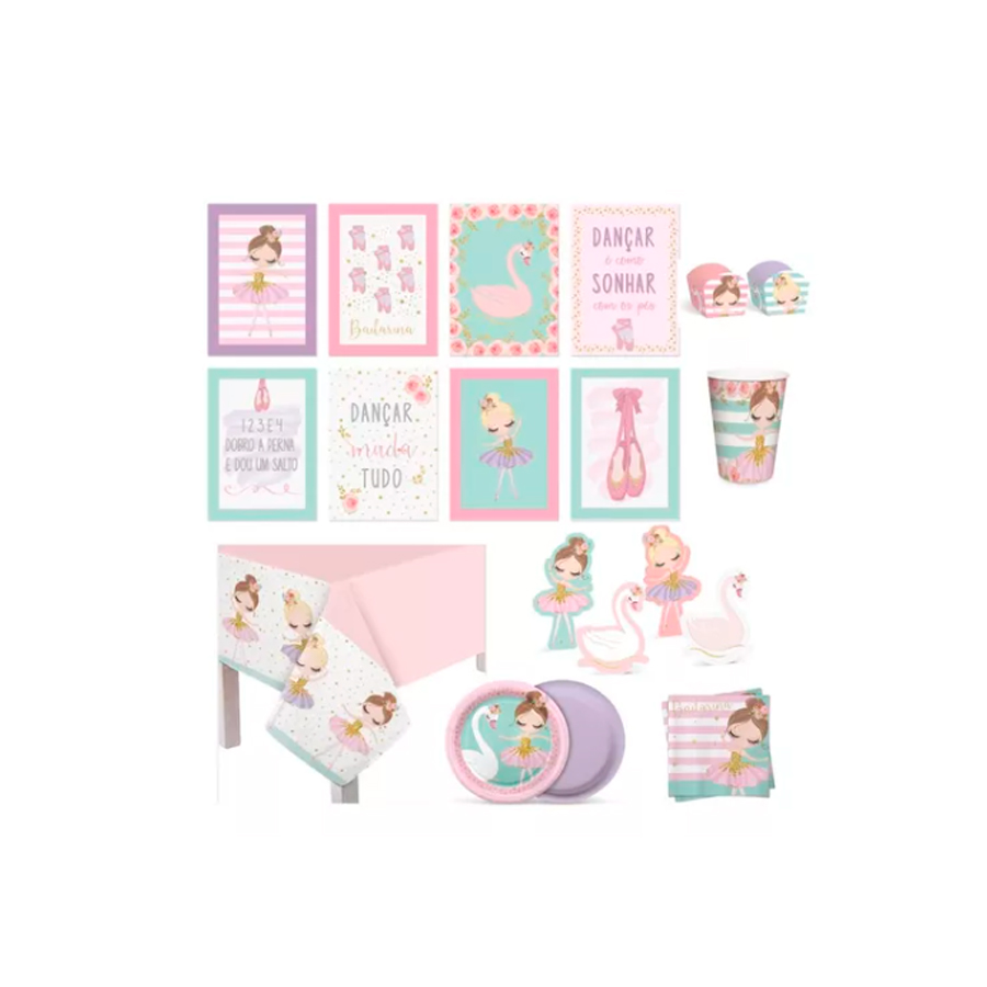 Kit com diversos itens com tematica de bailarina, contem 5 velas decorativas, 1 faixa decorativa, 4 silhuetas decorativas, 8 cartazes, 24 forminhas para doces e 20 baloes de latex 12" (30cm)