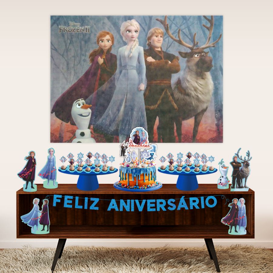 Kit Festa Fácil Frozen Disney é perfeito para criar uma decoração de aniversário encantadora e temática. Composto por 39 itens — incluindo 1 painel em TNT de 1,40m x 1m, 1 faixa “Feliz Aniversário” em E.V.A com glitter, 7 toppers para bolo (1 principal e 6 menores), 24 palitos decorativos e 6 decorações de mesa —, todos com cores vibrantes e design inspirado nas personagens Elsa e Anna Disney, trazendo magia e charme para a festa.
