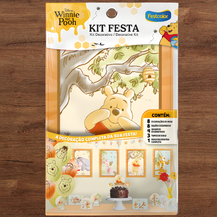 O Kit Festa Ursinho Pooh contém 24 peças decorativas, ideais para aniversários temáticos. Fabricado em material leve e resistente, é fácil de montar e perfeito para complementar a decoração de mesas, painéis e lembrancinhas.