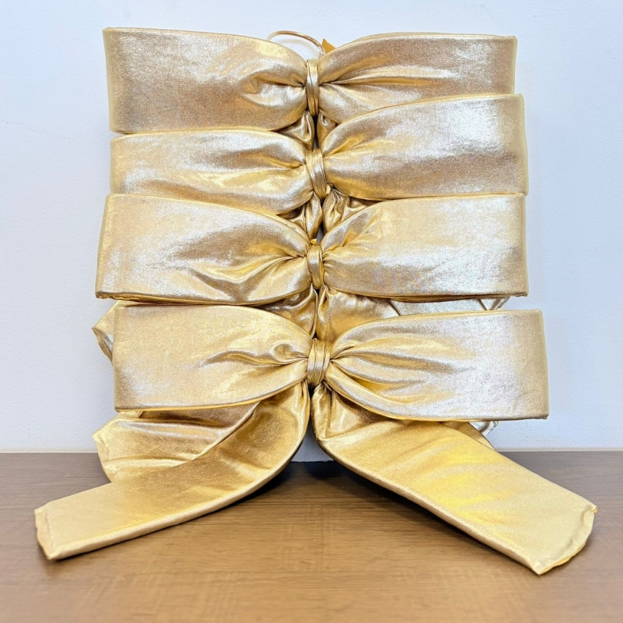 Trata-se de um kit de laços prontos em lamê dourado, tamanho M, com medidas de 26x22x4cm cada. Elegante, resistente e fácil de aplicar, é ideal para embalagens médias, lembranças sofisticadas e decorações de destaque.