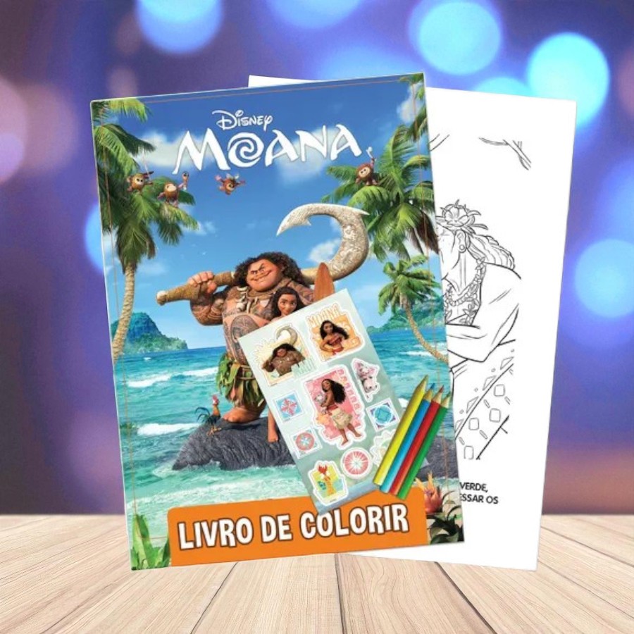 Kit compostor por 4 mini lápis de colorir, uma cartela de adesivos, um livro de colorir com 16 páginas. Inspirado na Moana Disney
