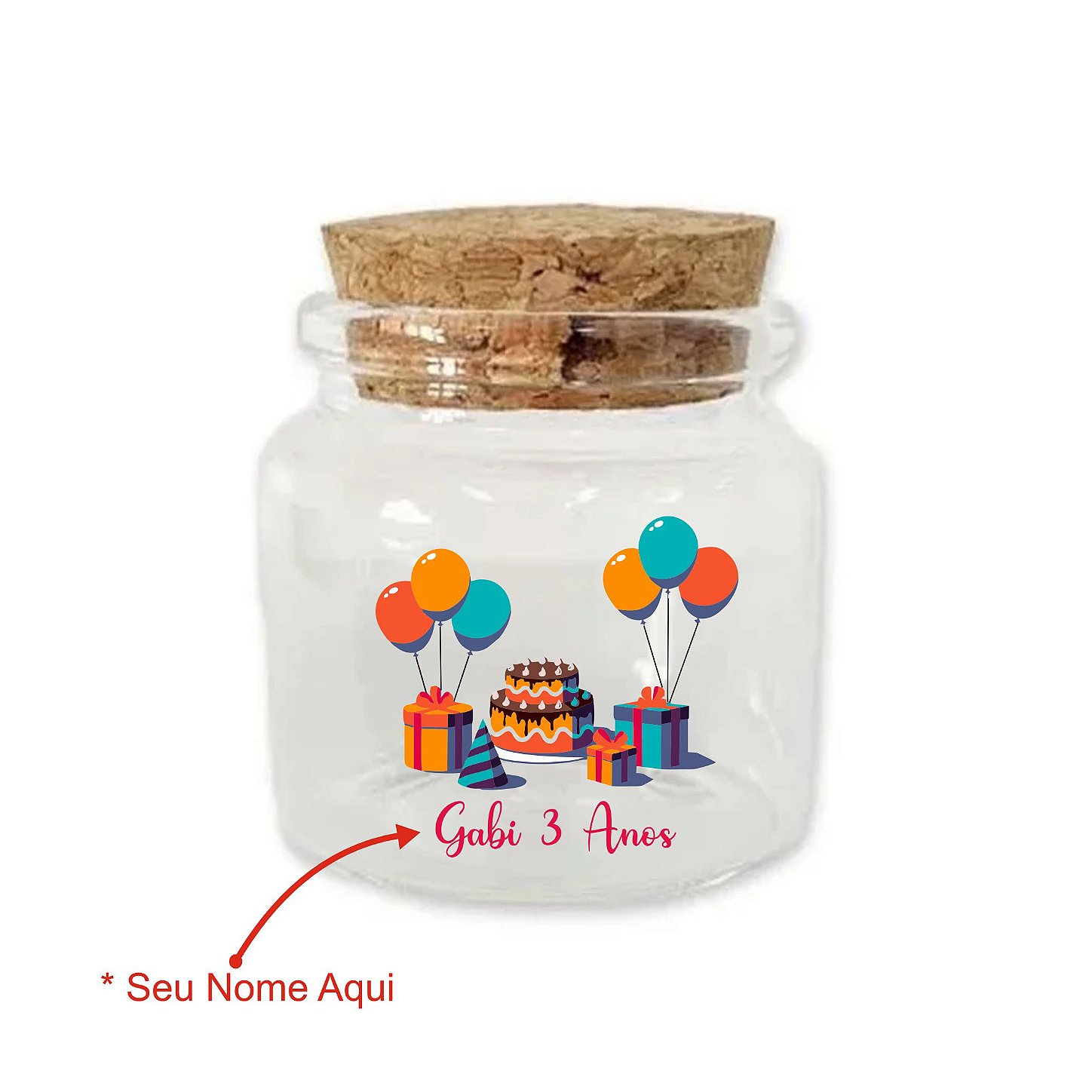 Kit Potinho de Vidro Personalizado de Aniversário com Tampa de Rolha 50ml - 4,5cm - 24 unidades - Rizzo