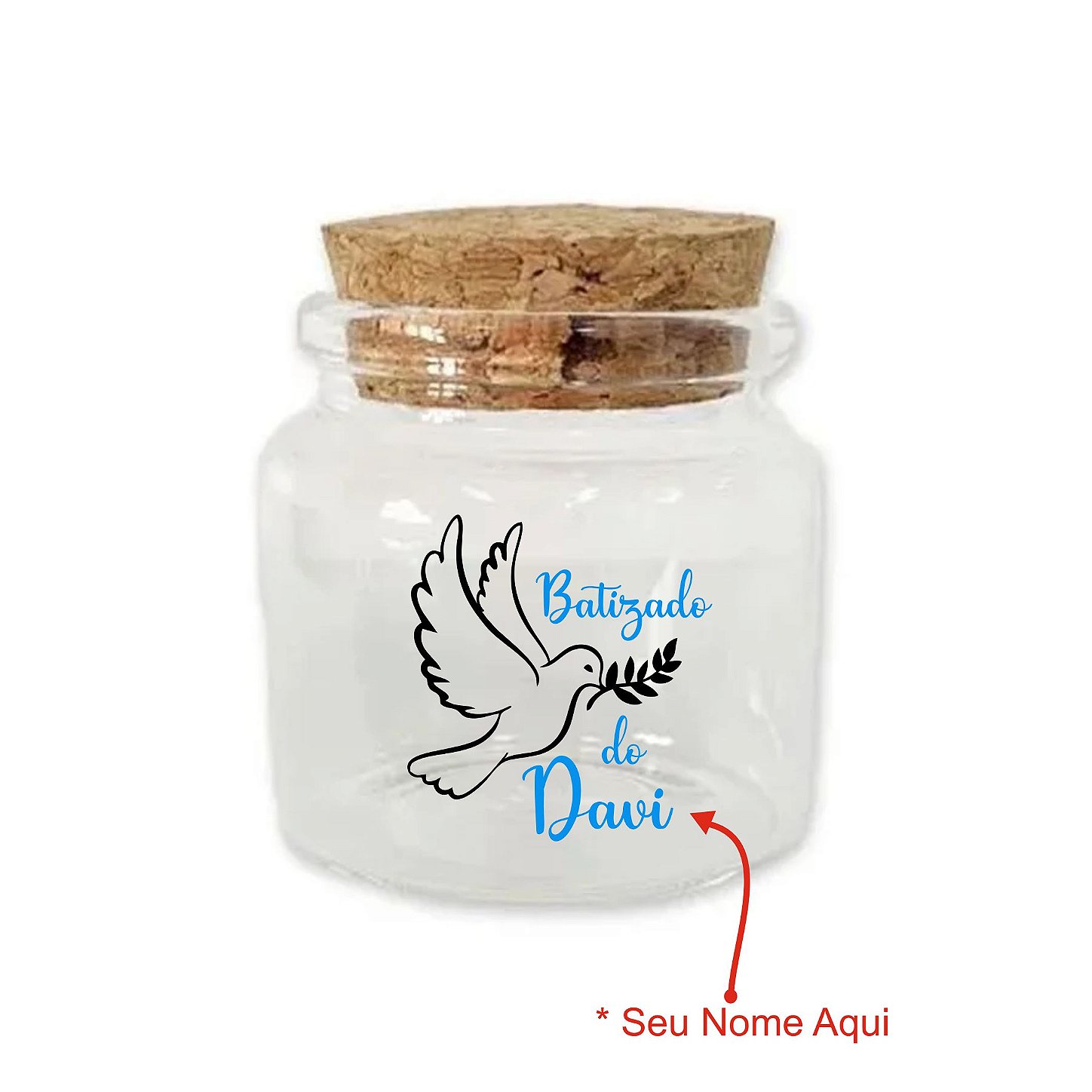Potinho de vidro com tampa de rolha, personalizado para batizados. Capacidade de 50ml e altura de 4,5cm.