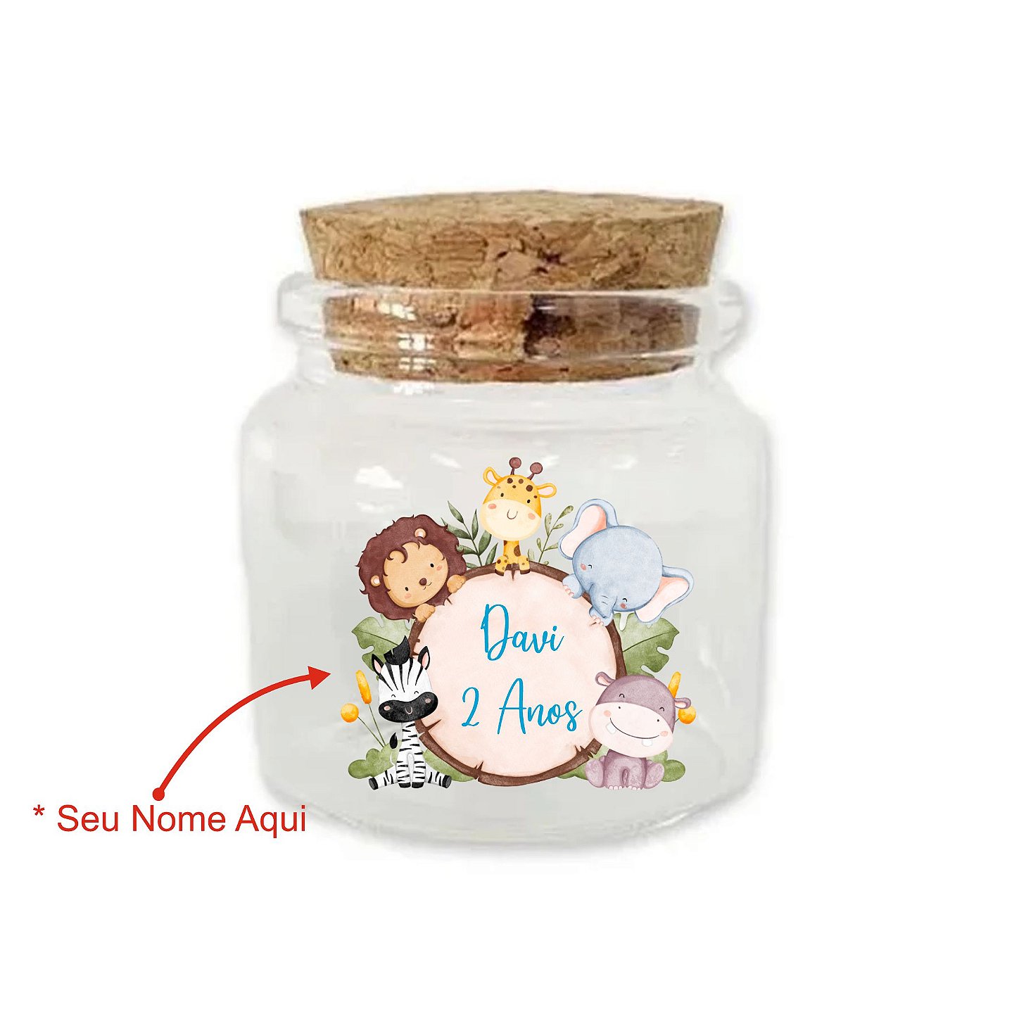 Potinho de vidro com tampa de rolha, personalizado com tema Safari. Capacidade de 50ml e altura de 4,5cm.