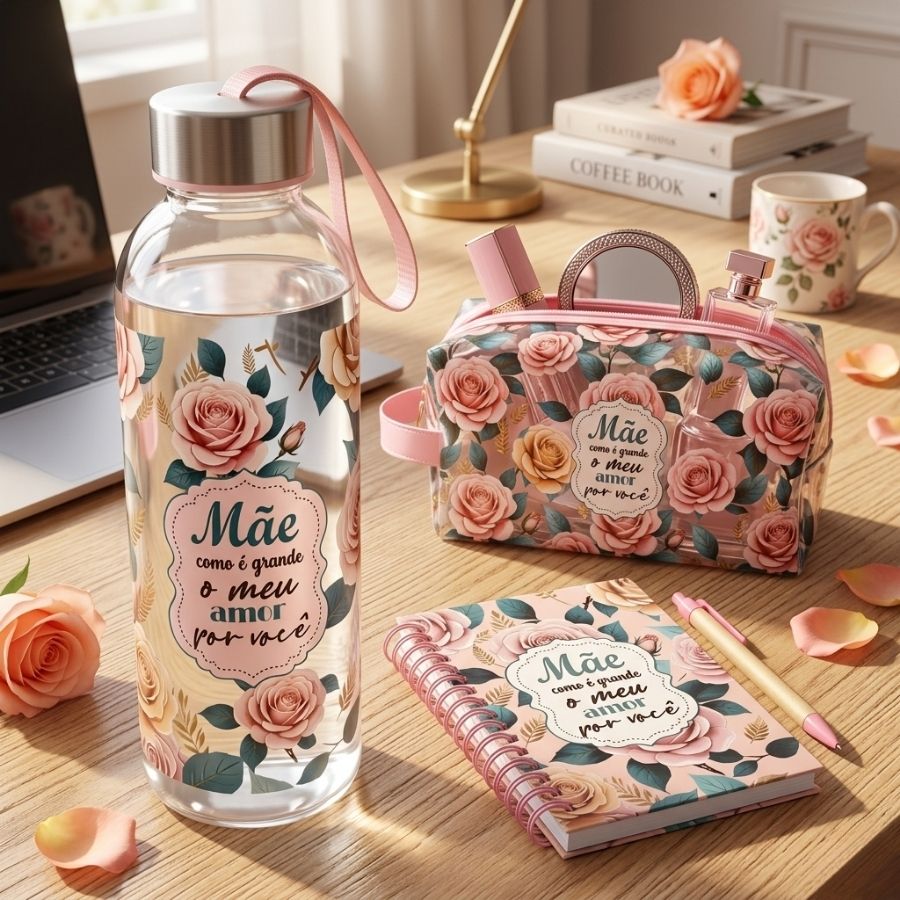 O bloco de anotações mede aproximadamente 8,5 x 12,5 cm e acompanha caneta, sendo ideal para registrar compromissos, listas, lembretes e ideias no cotidiano. A garrafa transparente com alça possui capacidade de 550ml e dimensões aproximadas de 6,5 x 20 x 6,5 cm, perfeita para transportar água, sucos ou outras bebidas com praticidade. Já a necessaire transparente, com cerca de 18 x 9 x 8 cm, oferece espaço para organizar maquiagens, acessórios, itens de higiene ou pequenos objetos, mantendo tudo visível e bem organizado. Esse kit é uma excelente escolha para presentes de Dia das Mães, lembranças especiais ou kits comemorativos, unindo organização, utilidade e um gesto cheio de carinho.