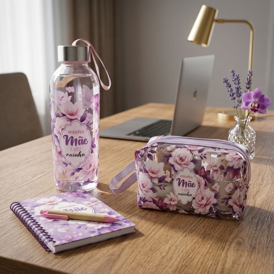 O bloco de anotações mede aproximadamente 8,5 x 12,5 cm e acompanha caneta, sendo ideal para registrar compromissos, listas, lembretes e ideias. A garrafa transparente com alça possui capacidade de 550ml e dimensões aproximadas de 6,5 x 20 x 6,5 cm, perfeita para transportar água, sucos ou outras bebidas com praticidade no cotidiano. Já a necessaire transparente, com cerca de 18 x 9 x 8 cm, é ideal para organizar maquiagens, acessórios, itens de higiene ou pequenos objetos, mantendo tudo visível e organizado. Esse kit é uma excelente escolha para presentes de Dia das Mães, lembranças especiais ou kits comemorativos, unindo organização, utilidade e um gesto cheio de carinho.