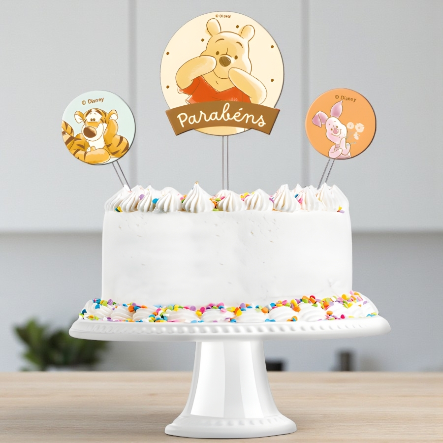 O Kit Topo de Bolo Ursinho Pooh possui 10x18,5cm, confeccionado em material resistente e colorido, pronto para uso. Ideal para complementar bolos de festas infantis, trazendo um acabamento visual encantador e temático.