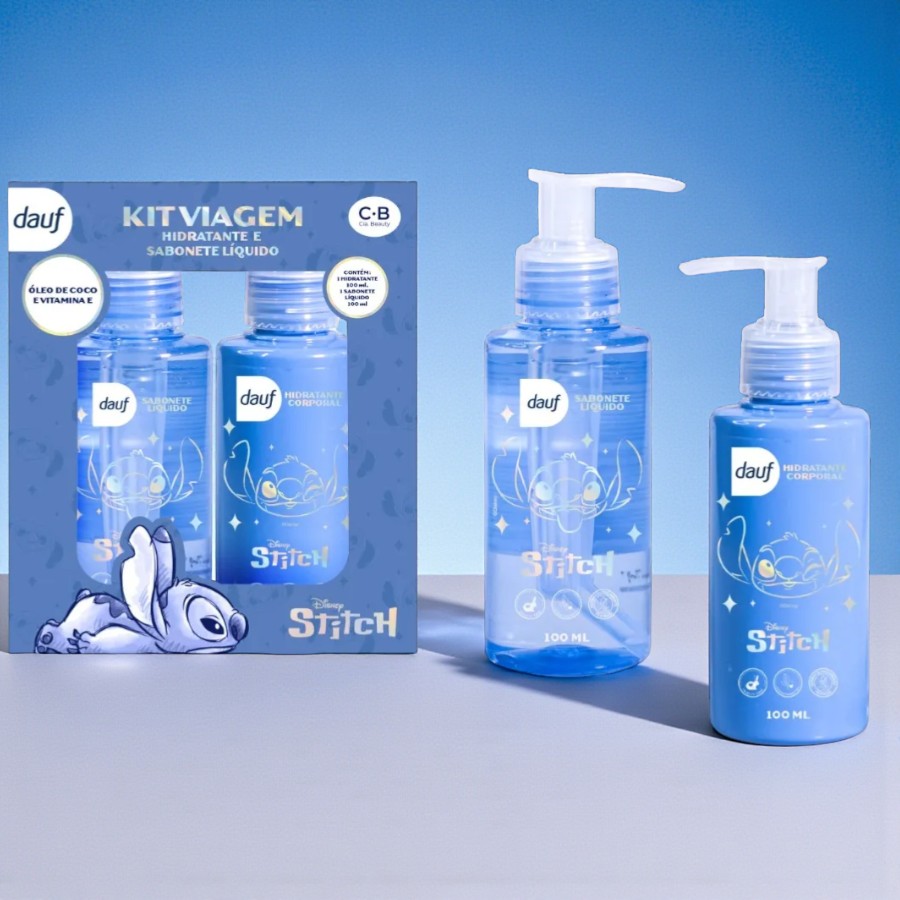 Kit composto por 1 sabonete corporal 120ml e 1 hidratante corporal 120ml, embalagens inspiradas em Stitch Disney