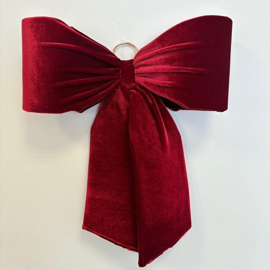 Trata-se de um laço pronto em veludo vermelho, tamanho G, medindo 32x34cm. Elegante, resistente e fácil de aplicar, é ideal para embalagens grandes, decorações marcantes e presentes que exigem acabamento de luxo.
