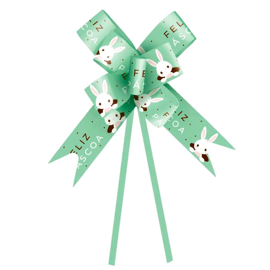 Laço Pronto para fechamento de embalagens, Ovos de Páscoa, Sacolas, entre outros, com tema de Páscoa, na cor verde, escrito ''Feliz Páscoa'' e desenho de coelhinho saindo da toca.