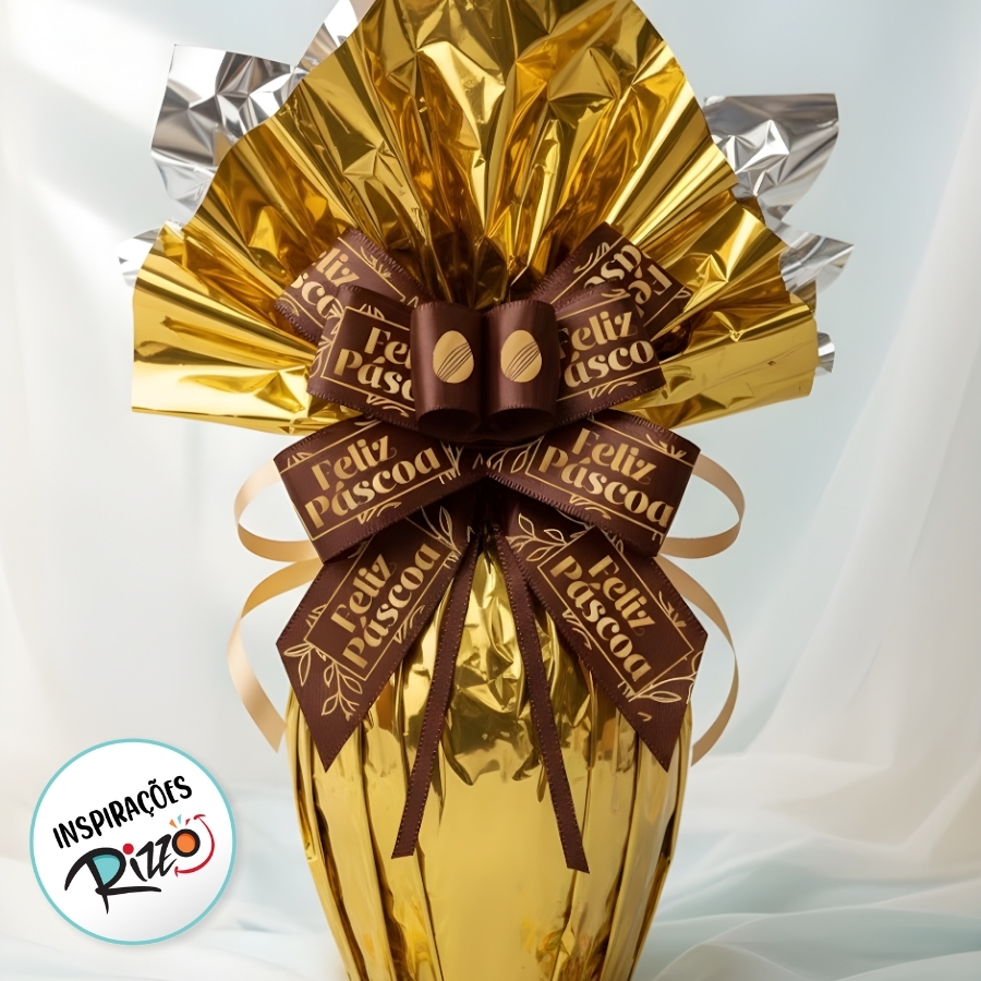 Esse laço resolve a necessidade de finalizar embalagens de forma rápida, padronizada e visualmente marcante, especialmente em períodos de alta demanda como a Páscoa. A estampa Feliz Páscoa em dourado sobre o fundo marrom reforça a temática comemorativa, aumenta a percepção de valor do produto final e chama a atenção no ponto de venda, sem exigir habilidades manuais ou tempo extra na montagem.