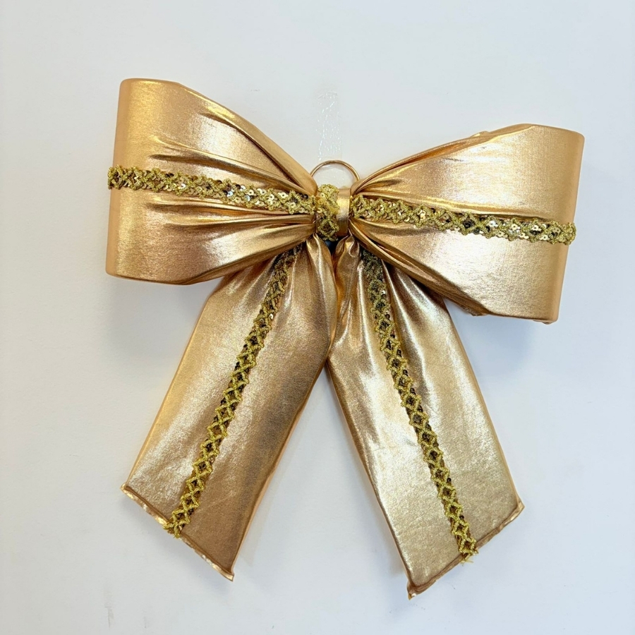 Trata-se de um laço pronto em lamê dourado com galão, tamanho G, com medidas de 30x36x8cm. Resistente, elegante e fácil de aplicar, é ideal para embalagens grandes, lembranças sofisticadas e decorações de destaque.