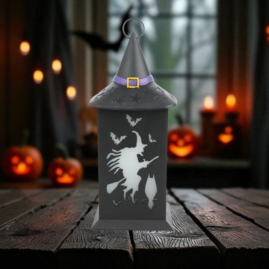 Lamparina decorativa Bruxa Mafalda, 34x13cm, com iluminação por 3 pilhas AA (não inclusas). Ideal para decorações temáticas e festas de Halloween.