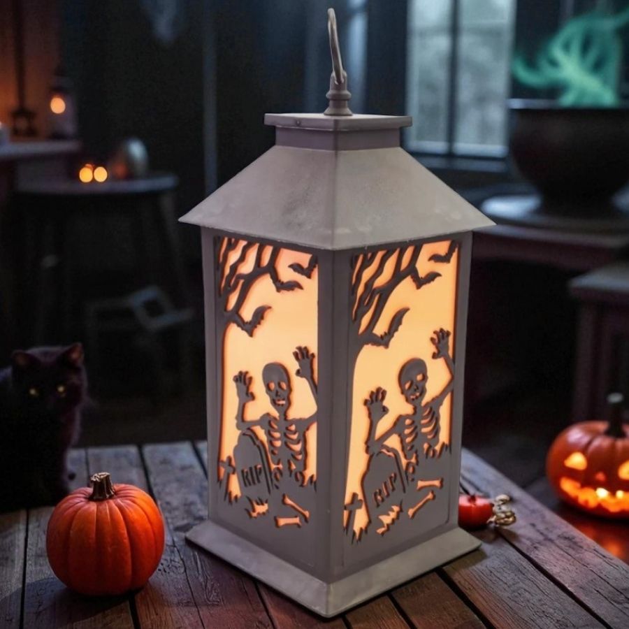 Esta lamparina possui iluminação interna e funciona com 3 pilhas AA (não inclusas), oferecendo praticidade e liberdade para posicioná-la onde desejar. Com medidas de 11,5x28,5x11,5cm, é ideal para complementar ambientes com um toque criativo, misterioso e cheio de estilo na noite mais assustadora do ano.