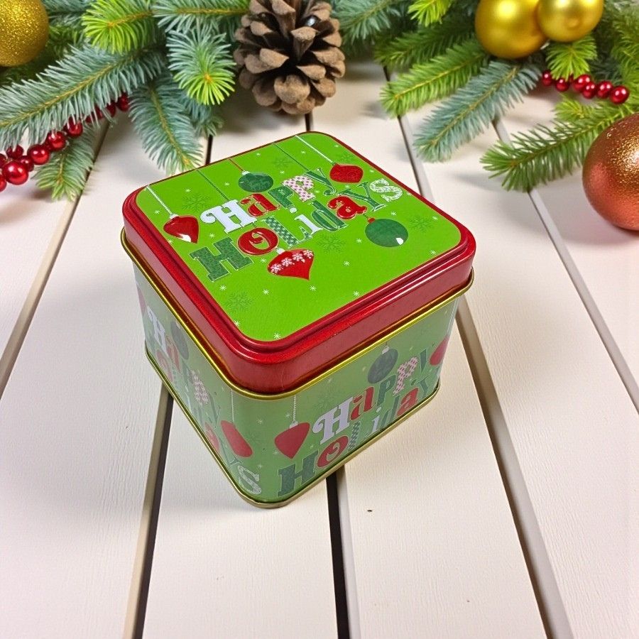 Lata de metal temática Happy Holidays, 7,5x7x6cm, ideal para doces, kits de presente e lembrancinhas natalinas.