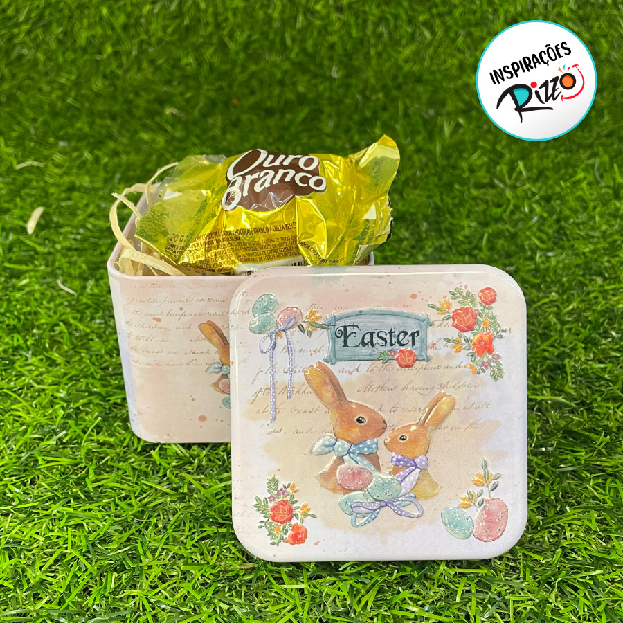 Esta pequena e delicada Lata Quadrada é perfeita para a Páscoa, adornada com desenhos temáticos encantadores. Coelhinhos, ovinhos de Páscoa e flores enfeitam sua superfície com um toque de elegância e alegria.