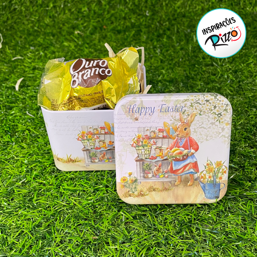 Esta pequena e delicada Lata Quadrada é perfeita para a Páscoa, adornada com desenhos temáticos encantadores. Coelhinhos, ovinhos de Páscoa e flores enfeitam sua superfície com um toque de elegância e alegria.