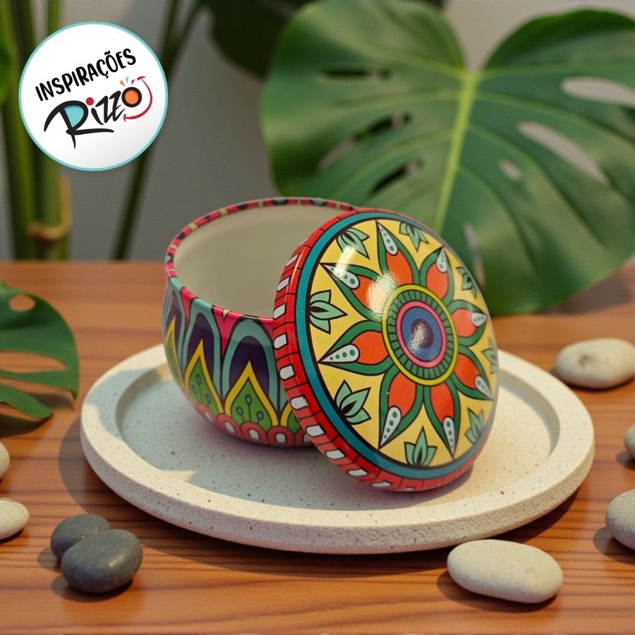 A Lata de Metal com Estampa de Mandala nas cores verde, azul e vermelho é uma embalagem decorativa vibrante e cheia de personalidade, ideal para valorizar lembrancinhas, presentes e kits especiais. Seu design inspirado em mandalas traz um visual moderno e marcante, perfeito para diversas ocasiões. Com dimensões de 7x7x4cm e capacidade de 130ml, é compacta e prática para armazenar pequenos itens.