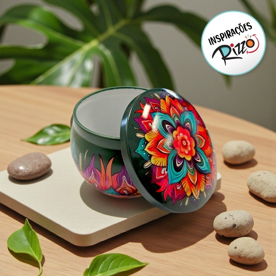 A Lata de Metal com Estampa de Mandala nas cores verde, azul e vermelho é uma embalagem decorativa vibrante e cheia de personalidade, ideal para valorizar lembrancinhas, presentes e kits especiais. Seu design inspirado em mandalas traz um visual moderno e marcante, perfeito para diversas ocasiões. Com dimensões de 7x7x4cm e capacidade de 130ml, é compacta e prática para armazenar pequenos itens.