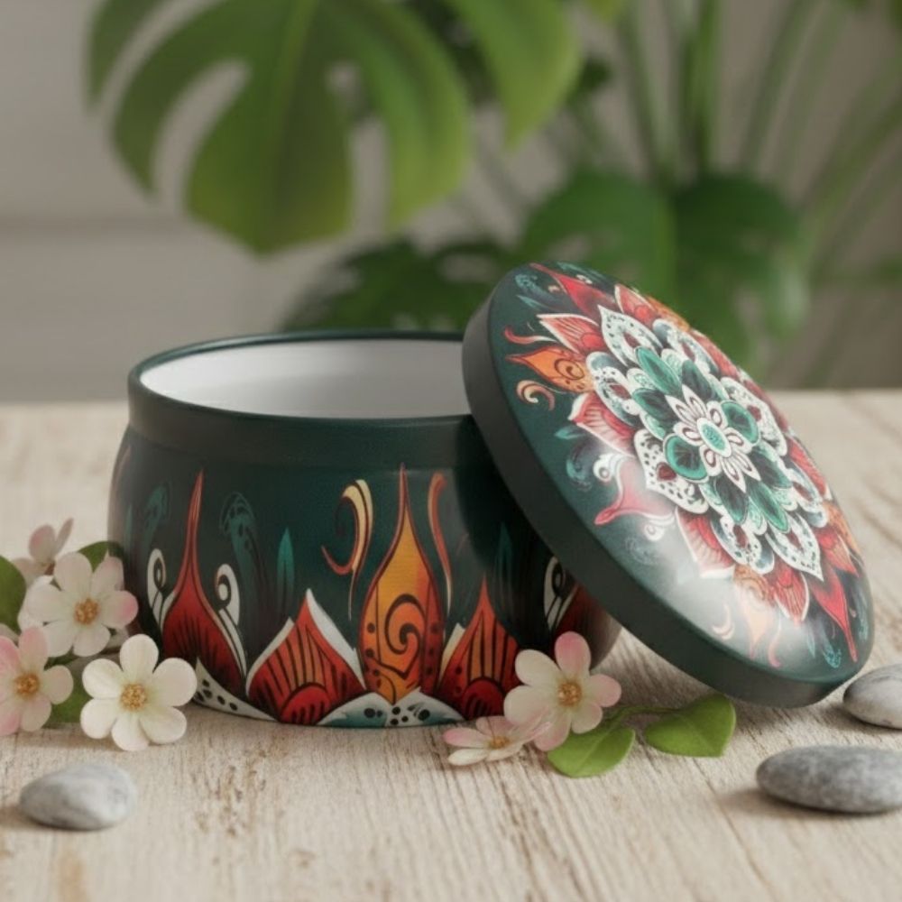 A Lata de Metal com Estampa de Mandala é uma peça elegante e marcante, perfeita para presentear ou decorar. Com fundo em verde escuro, a arte traz uma mandala detalhada em tons de vermelho, verde, branco e laranja, criando um contraste vibrante e sofisticado. A tampa também é estampada, formando um conjunto harmonioso e cheio de personalidade.