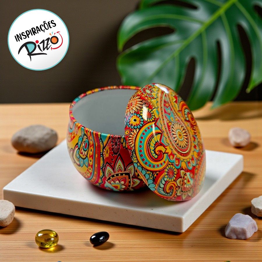 A Lata de Metal com Estampa de Mandala nas cores vermelho, amarelo e azul é perfeita para quem busca uma embalagem decorativa e cheia de personalidade. Seu visual vibrante inspirado em mandalas valoriza o produto e torna a lata ideal para lembrancinhas, presentes e kits especiais. Com dimensões de 7x7cm e capacidade de 130ml, oferece praticidade no uso e facilidade no armazenamento.
