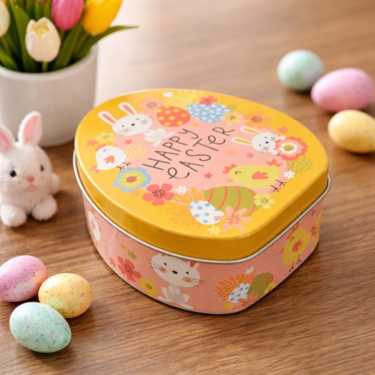 A Lata de Metal em formato de ovo traz um visual encantador com tons amarelo e rosa, trazendo o texto "Happy Easter" em destaque na frente. Sua arte inclui flores, ovos decorados, coelhinhos e outros elementos delicados que criam uma atmosfera doce e festiva — perfeita para compor lembranças e presentes de Páscoa.