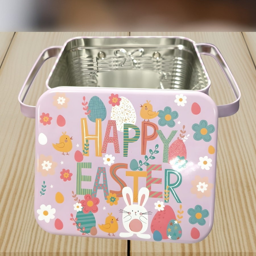 A Lata de Metal Retangular com Alça Dupla de Páscoa – Feliz Páscoa Colorido – 15,3x12,7x10,6cm é um recipiente metálico resistente e decorativo, com alças para transporte seguro. Seu design colorido e temático torna-a ideal para doces, lembranças ou pequenos presentes, combinando funcionalidade e estética.