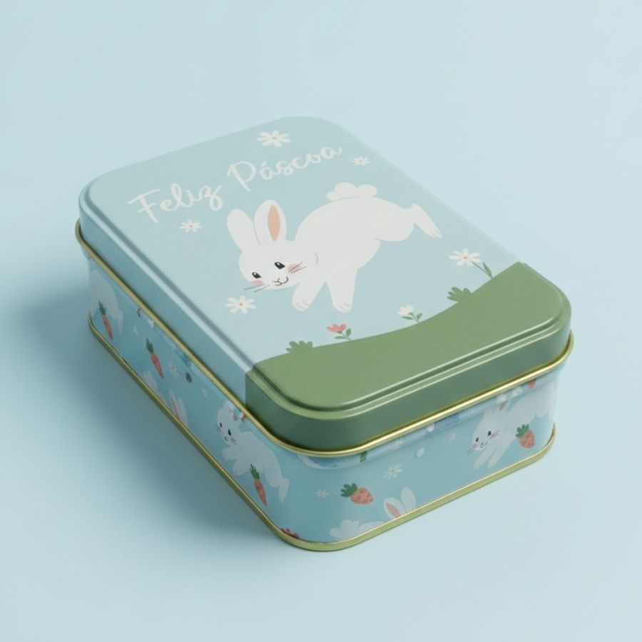 A Lata de Metal Retangular de Páscoa com estampa de Coelho Feliz Páscoa é um item decorativo e funcional, ideal para armazenar doces, lembrancinhas ou pequenos itens de confeitaria. A cor azul suave e o design temático transmitem calma, charme e sofisticação, tornando-a perfeita para composições de Páscoa com toque premium.