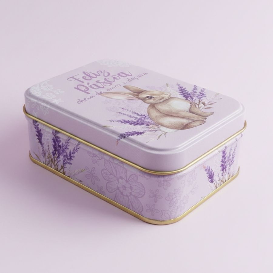 Lata de metal retangular decorativa, lilás, com estampa de Coelho Flores, 12,2x8,5x4,5cm, perfeita para presentes, doces e decoração temática.