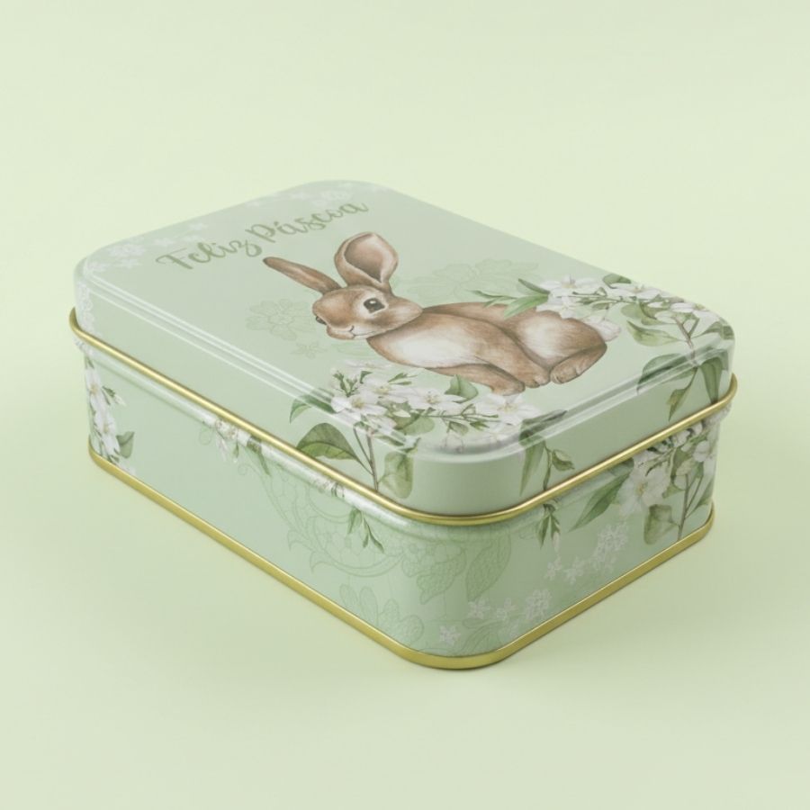 Lata de metal retangular decorativa, verde, com estampa de Coelho Flores, 12,2x8,5x4,5cm, perfeita para presentes, doces e decoração temática.