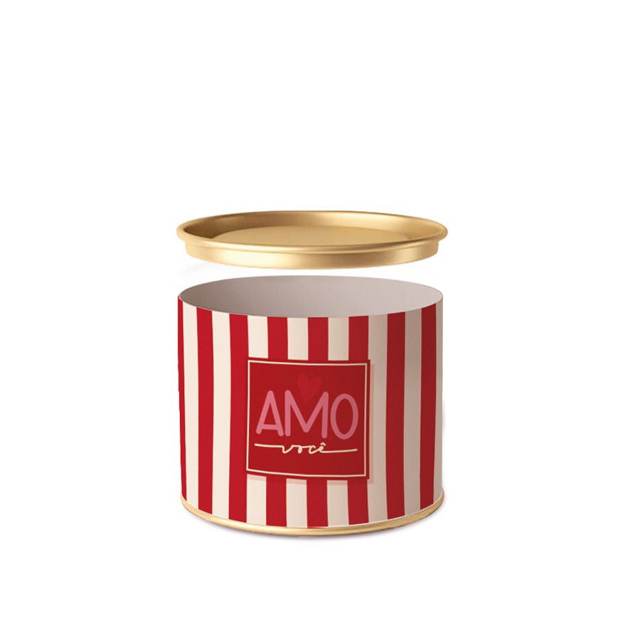 Lata redonda de Papel Cartão com Tampas de Metal, medindo 10 centimetros de diametro e 7 de altura, Ideal para armazenar doces e bombons, estampa com listras verticais brancas e vermelha destacando um quadrado vermelho com a mensagem "Amo Você" com um pequeno coração acima da frase