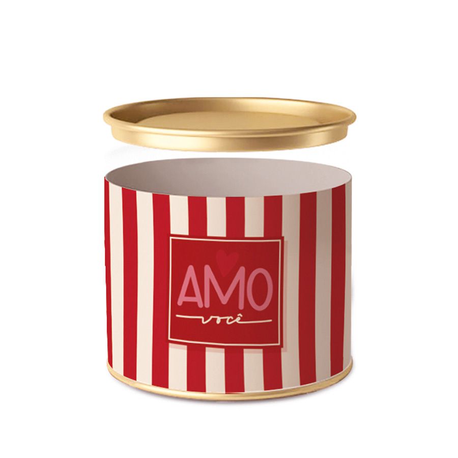 Lata para doce Rígida, com listras brancas e vermelhas, com quadrado central escrito ''Amo você''.
