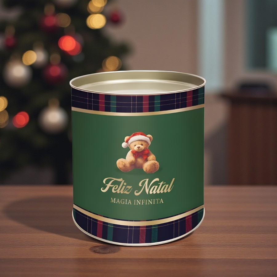 Perfeita para embalar mini panetones, doces ou lembranças, esta lata une praticidade e beleza em um só produto. Seu visual festivo e acabamento refinado fazem dela uma peça que pode ser reutilizada como parte da decoração natalina ou como embalagem decorativa.