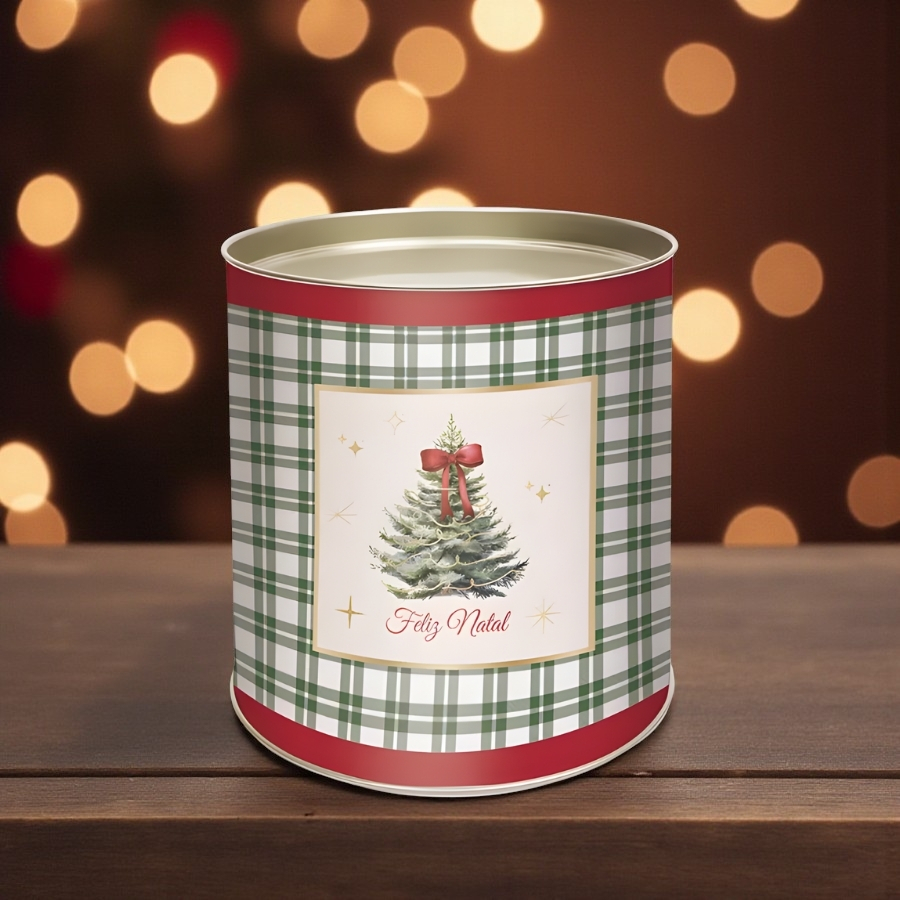 Lata rígida decorativa com estampa Pinheiro Xadrez Verde, desenvolvida para embalar panetones de até 250g. Produzida com material resistente, garante proteção e um visual elegante, sendo ideal para presentes, composições natalinas e uso comercial.