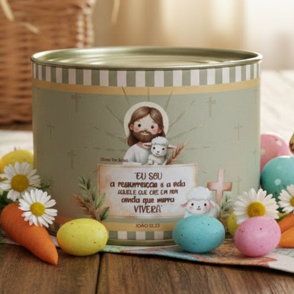 Ideal para montar kits de Páscoa com bombons, trufas e doces artesanais. Após o uso, pode ser reaproveitada como porta-objetos ou item decorativo com temática cristã.