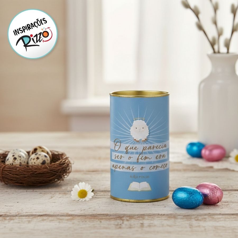 A Lata Rígida para Ovos de 250g modelo Cordeirinho Versículo é uma embalagem encantadora e resistente, ideal para valorizar a apresentação de ovos de chocolate e presentes temáticos. Sua estrutura rígida protege o conteúdo, enquanto a arte com cordeirinho e versículo transmite delicadeza e significado, perfeita para datas comemorativas e lembranças especiais.