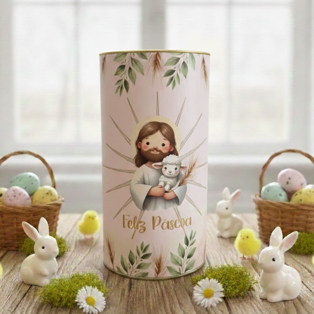 A lata rígida para ovos de 350g é uma embalagem especial e cheia de significado para presentear na Páscoa. Com dimensões de 18x10cm, apresenta acabamento em rosa com lindos detalhes decorativos, trazendo um visual delicado e sofisticado. O destaque fica para o desenho de Jesus segurando uma ovelhinha no colo, que transmite uma mensagem de carinho, proteção e fé, tornando a embalagem ainda mais especial e simbólica.