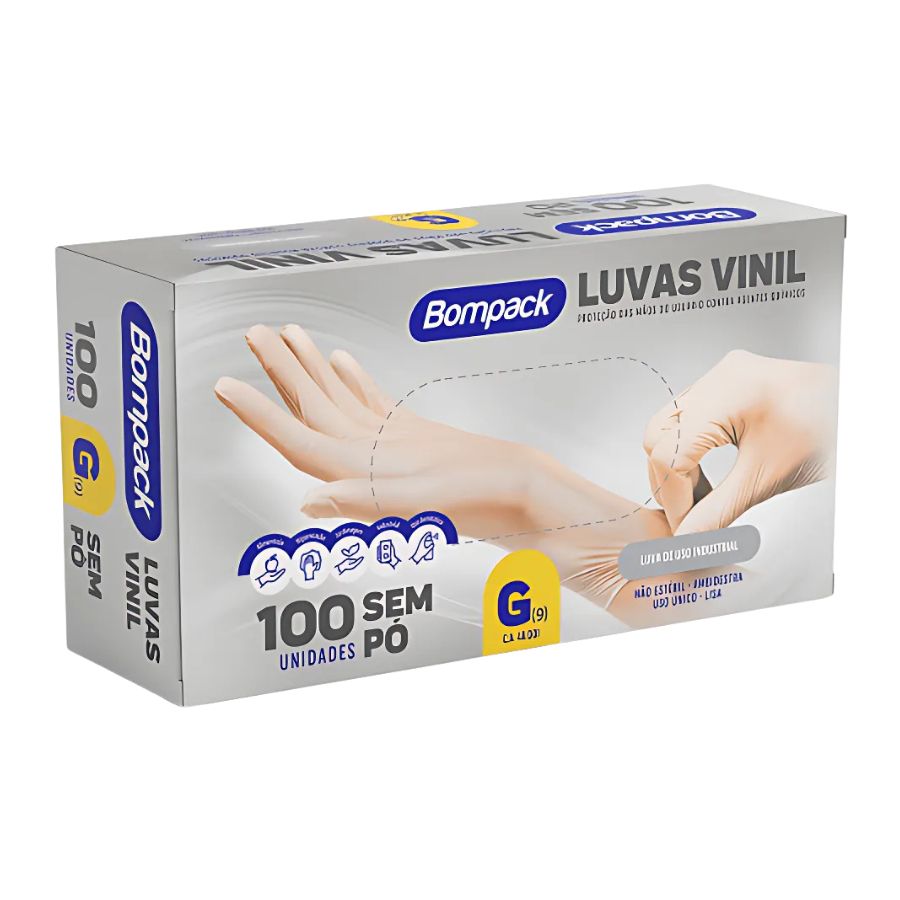 A Luva de Vinil Bompack Industrial G, com C.A. 48.001, é lisa, sem pó, não estéril, ambidestra e descartável, protegendo contra agentes químicos com segurança e conforto.