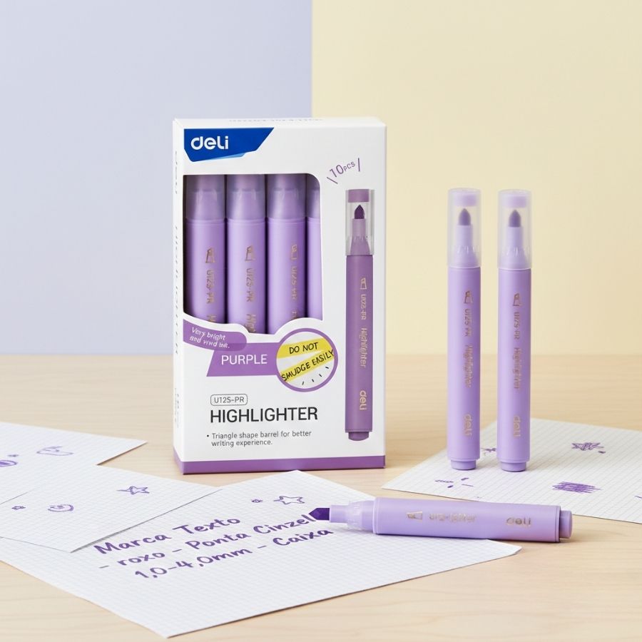 O Marca Texto Triangular Roxa é comercializado em caixa com 10 unidades, ideal para escolas, escritórios, uso coletivo ou revenda. Possui ponta cinzel de 1,0 a 4,0mm e excelente desempenho para organização de textos, destaque de informações e apoio nos estudos, garantindo praticidade e leitura mais organizada no dia a dia.