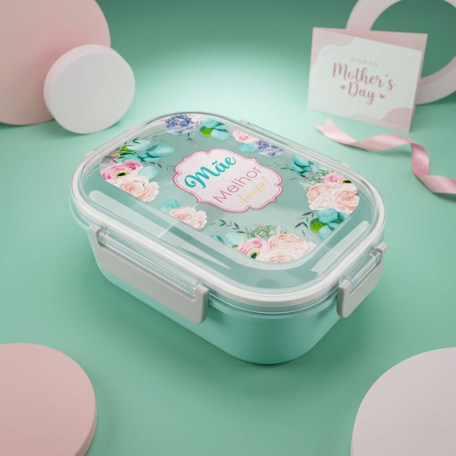 Fabricada em material plástico resistente, oferece durabilidade, leveza e facilidade no transporte. Com dimensões de 15,8 x 8,3 x 22cm, possui tamanho ideal para refeições completas. Sua tampa com fechamento seguro garante mais higiene e proteção, sendo perfeita para quem busca um produto funcional com um toque especial de carinho e significado.